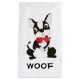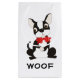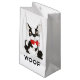 Ein niedlicher Boston Terrier Cartoon mit dem Text "WOOF". Sie können den Text mit Ihren eigenen Wörtern bearbeiten, wenn Sie möchten.
