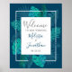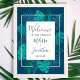 Herzlich willkommen bei Ihren Hochzeitsgästen in diesem schönen, modernen blauen botanischen Poster, das mit wildem Blattwerk und palmenfarbenen Blätter geschmückt ist. Ein schönes tropisches Schild mit einer Sommerzeremonie im Freien oder einer Hochzeit in Urlaubsort an einem hawaiianischen Strand.