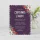 Modern purple Christmas party invitation featuring snowflakes and watercolor painting of poinsettia, holly and red berries.