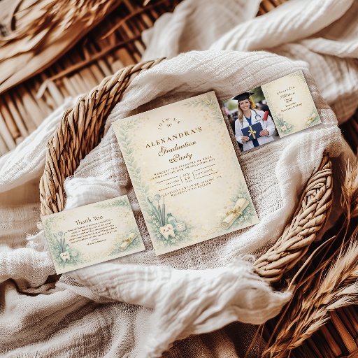 This elegant dentist graduation design features a soft botanical frame paired with dental symbols such as a white coat, dental tools, diploma scroll, and smiling tooth illustration. The calm green and ivory palette creates a polished yet welcoming look, perfect for celebrating dental school graduation, white coat milestones, or a dentist’s professional achievement. Fully customizable with names, dates, and event details.