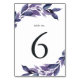 Elegante botanische Tischnummern mit kräftigen blauen und lila botanischen Blätter rund um Ihre Tischnummer. Design wiederholt sich auf der Rückseite. Koordiniert mit unserer reichhaltigen Foliage Violet Eventsammlung.