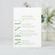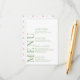 Genießen Sie den Charme Ihrer romantischen Hochzeitsfeier mit dieser raffinierten und gepflegten Speisekarte. Mit einem aufwändigen Muster, das mit zarter rosa Blume und grünen Blätter geschmückt ist, wird dieses wunderschöne Design mit Personalisierung erhöht und zeigt das Monogramm der Braut und des Bräutigams auf der Rückseite.