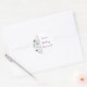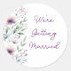Eine elegante Aquarellblüte mit violetten Blumen mit schlauer, grüner und staubiger blauer Laube und blumengeschmückten Hochzeitsaufklebern zum Siegel.