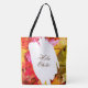 Schöne und farbenfrohe Herbstblätter in verschiedenen Tönen von Orange, Gelb, Grün und Rot. Hola Otoño, Hallo Herbst Grüße in brauner künstlerischer Kalligrafie, sowohl in Spanisch auf der Vorderseite und Englisch auf der Rückseite.