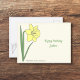 Eine hellgelbe Geburtstagskarte mit einer botanischen Daffodil-Blume-Illustration in Pastellfarben (Narcissus pseudonarcissus) und anpassbaren Texten (oben und unten): perfekt, um ein Geschenk zu begleiten oder an Ihren besten Freund zu schicken. Auf der Rückseite ist eine wilde Daffodil in line Art! Daffodil ist die Blume der Geburt des März, die Blume von Fischen und Äschen und ist symbolische Bedeutungen von Wiedergeburt, Vergebung, Kreativität, Energie und Vitalität.