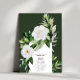 Aquarellfarbene inspirierte Abbildung weißer Blume mit botanischem Design, wirbelt um weißes Rechteck mit Text. Hintergrund ist dunkelgrün.