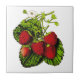 Keramik-Kachel in einem Druck einer Erdbeerauslaufsbeere-Pflanze, angepasst an Vintage botanische Zeichnungen - tiefrote Beeren auf weißem Hintergrund