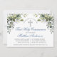 Moderne Elegante Erste Heilige Kommunion Einladung beinhaltet Aquarellfarben Eukalyptus-Blätter und andere schöne botanische Grünpflanzen. Dusty Blue Back. Silberkreuz.