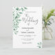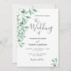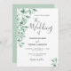 Eine trendige Hochzeitseinladung in Weiß und Grün. Ein schick weißer Hintergrund auf der Vorderseite. Grüne botanische Vegetation, üppige Pflanzen und Blätter. Moderne, große handhabete Schrift, Typografie mit dem Text: Die Hochzeit von. Vorlagen für Namen und Hochzeitsdetails. Dunkelgrauer Text. Zurück: grüner Hintergrund.