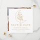 Erzählen Sie Ihren besonderen Tag mit diesem eleganten botanischen Foto des Mondes und der Sterne Save the Date. Die quadratische Karte zeigt eine goldene Zeichnung eines halbmondförmigen Mondes, der mit funkelnden Sternen und botanischem Blattwerk auf weißem Hintergrund verziert ist. Elegante moderne Kalligraphie hebt Ihre Details hervor und verbindet den himmlischen Charme mit einem raffinierten Stil. Auf der Rückseite finden Sie Ihr vollblütiges quadratisches Verlobung-Foto, das einen personalisierten Sake für Freunde und Familie schafft.