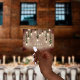 HochzeitsrSVP mit Vintagen Edison-Hängeleuchten, die mit botanischem Grün über einem rustikalen Backsteinhintergrund verziert sind.
