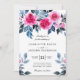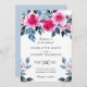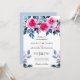 Elegantes Hochzeitsdesign mit hellrosa Aquarellfarben, blauem und grauem Blattwerk auf weißem Hintergrund. Die Rückseite der Einladung ist in staubblauer Farbe.