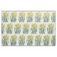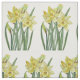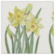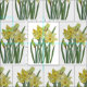 Entworfen auf Aquarellblumen-Illustration von Narzissen von Farida Greenfield. Schöne und zarte gelbe Daffodien flattern und tanzen im Frühjahr mit grünem Blattwerk um sie herum und einige Knospen bereit zu blühen.