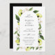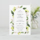 Elegante botanische Zitronen, Blätter und Blüten, Hochzeitseinladung. Trendy Bogenrahmen mit koordinierender schwarzer Farbabdeckung. Die Einladung bietet schicke Typografie Design Stil Mix aus Kalligraphie und fett-Typ.