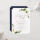 Elegante grafische Kalligraphie mit botanischen Zitronen, Blätter und Blüten, Bogenrahmenbesetzung Einladung. Die Karte verfügt über eine moderne Typografie-Design-Stilvorlage und koordiniert marineblau blaue Farbsicherung.