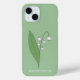 Ein grüner Handykoffer mit botanischer Lilie der Blume im Tal in Pastellfarben (Convallaria majalis) und einem anpassbaren Text am unteren Rand: perfekte Geschenkidee für ein Mädchen, das Blume Liebe. Lily of the Valley ist die Blume der Geburt im Mai, die Blume des Taurus und ist symbolische Bedeutungen von Liebe, Glück, Reinheit, Mutterschaft und Demut.