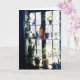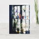 Ein schönes Fenster mit alten farbenfrohen Glasflaschen und einer leeren Grußkarte für Pflanze.