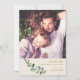 Ein Single Eukalyptus frond Wirbel zu einem Paar Foto aus Goldtext vor einem Elfenbeinhintergrund in diesen einfachen, eleganten Save the Date Ankündigungen.