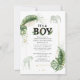 Giraffe zum Thema Wildwald und elegante Jungs Safari Baby Dusche Einladung mit einer Giraffe, einem Elefanten, Goldfolie und grünen Blätter. Perfekt für die Einladungen eines kleinen Jungen mit einer Babydusche