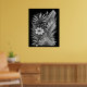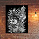 Eine komplexe und detaillierte Abbildung der tropischen Blume und Schilf, die in einer schönen Komposition angeordnet sind. Das Schwarz-Weiß-Farbschema verleiht der Illustration ein Gefühl von Eleganz. Diese Abbildung ist mit einem schwarzen Hintergrund gestaltet, um den Blume und Schilfblättern einen besonderen Touch zu verleihen.