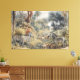 Botanische Szene von Zebras und Löwen in einer Oas Leinwanddruck