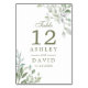 Rustikale botanische Tischnummer der Wasserfarbe. Dieses schlichte botanische Design mit Aquarellfarben-Eukalyptus-Blätter in Grün- und Weißtönen.