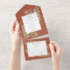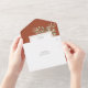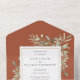 Alle in einer Hochzeitseinladung mit eleganten botanischen Aquarellfarben-Blätter auf Terrakotta-Hintergrund und einem schicken goldenen Rahmen. Die Einladung enthält eine perforierte RSVP-Karte, die für Sie individuell adressiert oder links als leere Adresse für die Handschrift der Adressdaten Ihres Gastes verwendet werden kann. Entwickelt von Thisisnotme©
