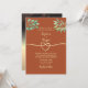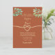 Moderne, elegante, botanische Terrakotta Hochzeitseinladung mit Imitaten goldenes Seil, Aquarellblütengrün, modernes Kalligraphiegeschreiben und Foto mit Monogramm hinten.