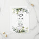 Die moderne Elegant Watercolor Botanical Greenery Save the Date Card beinhaltet Eukalyptus-Blätter, grünes botanisches Blattwerk, staubblaue Blätter und andere wunderschöne botanische Pflanzen.