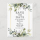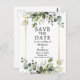 Moderne Botanische Grünpflanzen Save the Date Postcard mit eleganten Watercolor-Blätter, grünem botanischem Blattwerk, staubblauen Blätter und anderen wunderschönen botanischen Pflanzen. Goldrahmen.
