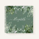 Das Botanische Grün-Notebook bietet Efeu-, Farn- und Salbei-Blätter. Ihr Name in einem stilvollen Skript. Sage Green Hintergrund.