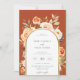 Elegant erdigen Herbst botanische Blüte, Hochzeit Einladung. Bogenrahmen mit goldenem Akzent und Koordination der Terracotta orange Hintergrund. Die Einladung bietet schicke Typografie Design Stil Mix aus Kalligraphie und fett-Typ. Vollblutende Single Foto auf der Rückseite.