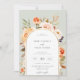 Elegant erdigen Herbst botanische Blüte, Hochzeit Einladung. Bogenrahmen mit goldenem Akzent und Koordination von schlanke grüne Hintergrundfarbe. Die Einladung bietet schicke Typografie Design Stil Mix aus Kalligraphie und fett-Typ. Vollblutende Single Foto auf der Rückseite.