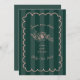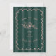 Hochzeitsthema mit Text in handgezeichnetem, rosa Rahmen mit rosa blühender botanischer Linie, zeichnend über smaragdgrünen Streifen Hintergrund.
