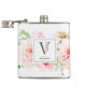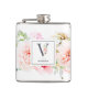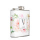 Elegante Aquarellfarben Rosa, bordeauxrote und weiße Blume und zartes Gartengrün mit dem verzierten Buchstaben "V" in Schiefergrau, Monogramm-Kolben. Flask enthält eine Textzeile für Single-Vorlagen, die mit Namen personalisiert werden soll.