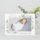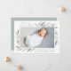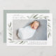 Elegante botanische Geburtsankündigung in eleganten Pastellfarben mit einem Single voll blutgefärbtem horizontales oder landschaftsorientiertes Foto mit Haufen von zarten, blassgrünen Aquarellfarben-Blätter an den Ecken. Personalisieren Sie Ihre Daten mit dem Namen des Babys, den Geburtsstatistiken und einer persönlichen Nachricht, und fügen Sie drei zusätzliche quadratische Fotos hinzu.