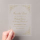Diese elegante Vintag-inspirierte formelle Hochzeit speichert die Dattelkarte in goldfarbenem Drehbuch und Serif-Schriftart, gerahmt durch ein zartes Vintages Goldrebenmotiv, auf einem transparenten Hintergrund.