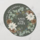 Traditionelles Design mit moderner Drehung. Die rustikale botanische Rahmenkonstruktion mit pinecones und weißen Blume ist traditionell und die Rundkarte ist modern! Laden Sie das Foto Ihrer Verlobung für die Rückseite hoch, zusammen mit dem Datum und den Namen, die Sie anpassen möchten.