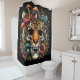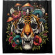 Eine extrem detaillierte atemberaubende Farbtönansicht einer Tiger- und Tigerschädelmischung mit Bio Blume, botanischen Stoffen und Pilzen, die daraus wachsen.