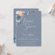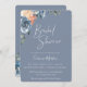 Elegante Aquarellgarten Blume und botanische Äste in trendigen Blautönen, Pfirsich und Grün, Brautdusche Einladung. Die Karte verfügt über einen soliden, blau-farbenen Hintergrund und eine weiße Schrift.