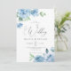 Elegante Blumenhochzeit in einer Einladung. Moderne botanische Hochzeitseinladung mit Kalligraphie-Skript und handgemalten Aquarellfarben-Blume in hellblau mit Grün mit Details und QR-Code-UAWG in der Rückseite. Sie können die Formulierung, den Stil, die Farbe und die Größe des Schriftartes vor und hinter der Einladung personalisieren. Bitte kontaktieren Sie mich für passende Artikel.