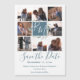 Die dusty blauen und Salbei-Monogramm-Hochzeit speichern das Datum, acht Foto, Blockstil-Magnetankündigung mit wunderschönen Salbei-Aquarellfarben-Blätter, die um die modernen Schriftzeichen im Mittelblock kreisen.