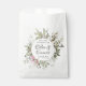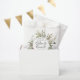 Ein moderner botanischer Kranz ist mit weißen Hydrangea-Knospen dekoriert und ein Schlag mit rosa Rosenknospen. Die Namen der Ehepaare sind in einem großen Script-Schriftart geschrieben. Babydusche und das Dankeschön Gefühl folgen.