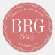 Delikate botanische Rundrahmen mit individualisierbaren Vielen Dank für Ihren Einkaufstext, Monogramm-Initialen, Art des Produkts, in diesem Fall Seife, und Standort, wo das Geschäft begann. Ideal für nach dem Kauf Verpackung. Weiße Schrift auf indianischem Rose- oder Kastanienhintergrund.