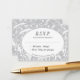 Hübsche, elegante botanische Silhouetten der Natur, weißes Blattwerk, Blätter und Blume auf silbergrauem Hintergrund. Eine wunderschöne, koordinierende Hochzeitskarte R.S.V.P., die Sie ändern können, um Ihre eigene Feier Anzug. Originelle Kunst von Nic Squirrell.
