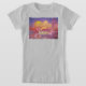 Die Mauer, in den Originalwerken von ZoeSPEAK auf diesem T - Shirt, ist eine alte, rote Ziegelmauer mit einem Wandgemälde auf Stuck, das zerfällt. Das Wandgemälde ist ein Bild von puffigen Wolken im Sonnenuntergang, ganz rosa und hellgelb oben an einem tiefblauen Himmel. Die Botschaft ist, den Sonnenschein lassen.