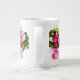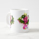 Dieses Foto aus einem üppigen, weißen Strauß, Lilienknospen und Blume, hellrosa Rosen, dunkelrosa Anemonen, mit grünen Blätter und Stielen in rosa Papier eingewickelt, in einem runden, rosa, rosa, vase angeordnet, daneben Muttertag, eine Karte.