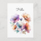 Ein Aquarellbild hübscher Blume in aquamarin, pfirsichfarben, rosa, lila, grün. Dieser botanische Ausdruck ist perfekt für einen einfachen Hallo-Gruß, aber Sie können den Text zu Ihrem bevorzugten Gruß ändern. AI unterstützte Grafik, die mit kommerziellem Einsatz erworben wurde. Kunstwerk: DreamCafeArt