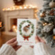 Wrap your holiday greetings in timeless charm 🎀 with this elegant Christmas card design featuring a red bow with gold accents and a watercolor greenery frame. 🌿✨ The soft oval wreath of leaves and berries creates a warm, painterly feel that beautifully complements your favorite family photo. Set against subtle cream stripes, this design blends classic holiday elegance with modern chic simplicity — a perfect way to share heartfelt wishes and cozy festive cheer with loved ones. ❤️