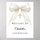 A large ivory colored bow with pearls and a golden cross as decoration. Personalize and add her name.